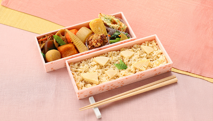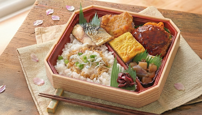 人気のだし巻きたまごや焼き魚にしらすご飯。自慢のおかずを少しずつ楽しめる、春にぴったりの彩り弁当です。
