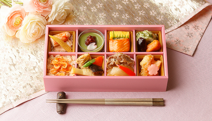 春ならではの桜海老御飯に、人気の牛すき焼が乗った白御飯、性別年代を問わず楽しめる御飯を二種類お詰めしました。甘味には好評の抹茶プリンをお入れして、満足のある内容に仕上げております。