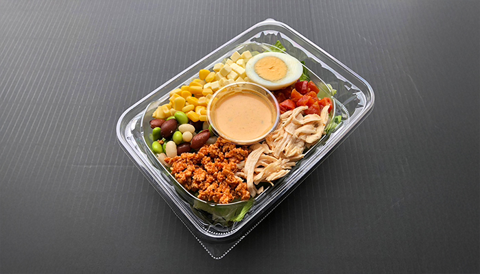 鶏×大豆のタコスミートに、蒸し鶏と4種豆とチーズとトマト。スパイシーなマサラヨーグルトが陽気にまとめます。