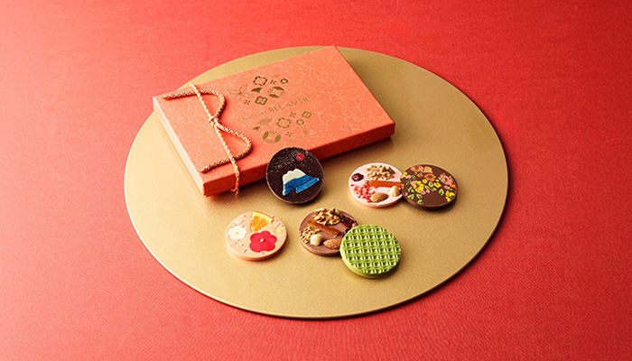 御年賀限定のパレショコラ6枚入詰め合せ。「日本」をイメージしたチョコのデザイン。箱のデザインも高級感のある特徴的なギフトです。