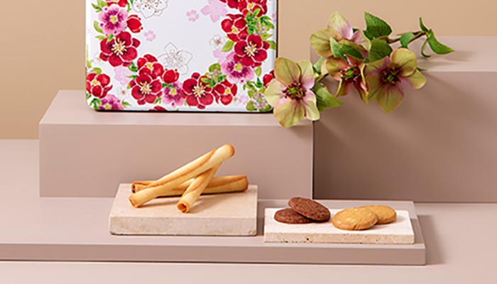 ロングセラーのシガール2種と季節限定のクッキー2種の詰め合わせです。日比谷花壇とコラボした冬の花「寒芍薬」が描かれています。
