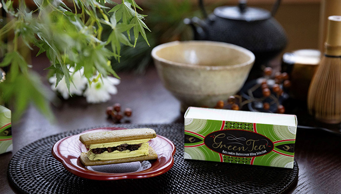 正月の手土産に人気の和テイスト。抹茶バタークリーム、粒あん、ブランデーレーズンと素材を贅沢に使用したリッチで味わい深い抹茶のバターサンドです。