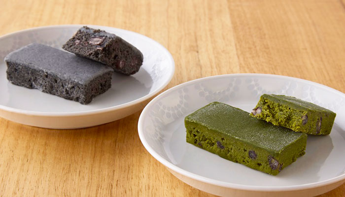 しっとりとした濃厚な生地のケーキに、小豆の食感がアクセントに。和と洋を重ねた黒ごまと抹茶の2種類が楽しめる新しいお菓子です。