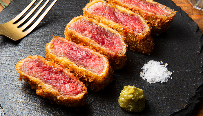 赤身の王様フィレを使用。しっかりとした肉の旨みが楽しめる牛カツ。加熱時間にこだわり、均一に火を通しレアに仕上げました。