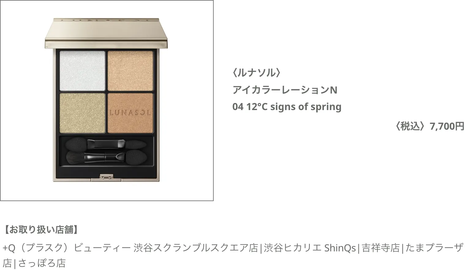 Dを上まぶたと下まぶたを囲むようにアーモンド型に広げる。B と C をブレンドして上まぶたに広げる。こうすることで、まぶたに奥行きが出る。A のシルバーのラメを目頭に「くの字」にちょい足しすることで、ぐっとイマドキ感が演出できる。