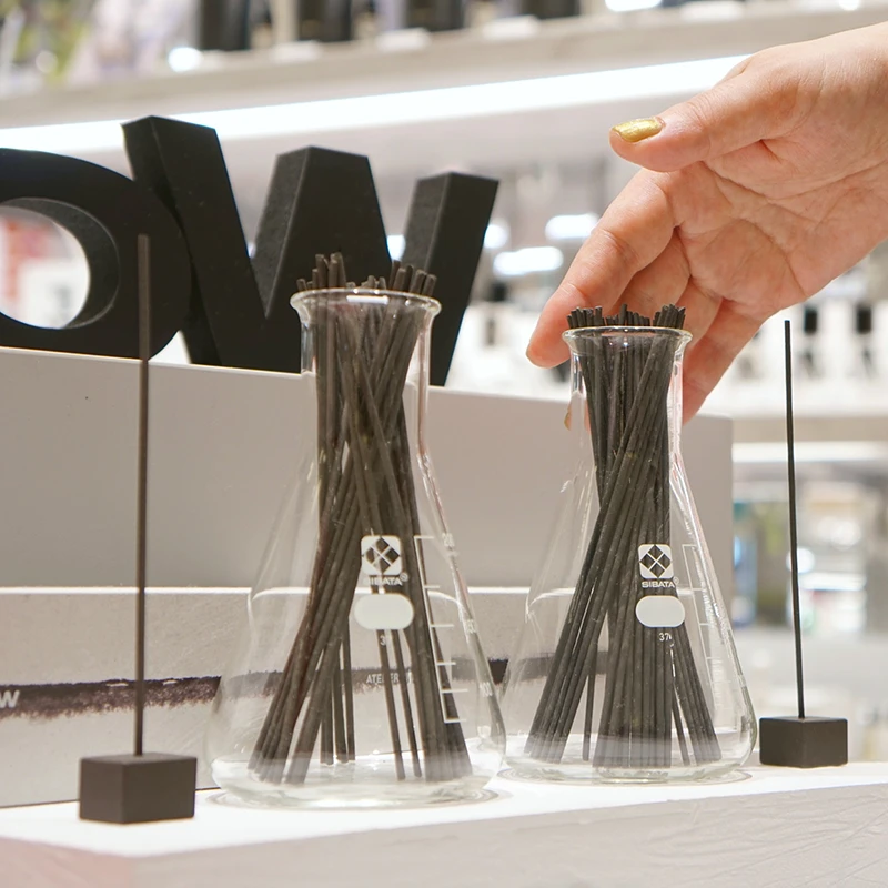 〈RboW〉が手がけるお香「インセンススティック」は、天然香料や木炭といった自然由来の素材を使用し、熟練の職人が伝統的な手法で一本一本を丁寧に成形しています。火を灯したとき、煙が少ないことに驚きました。