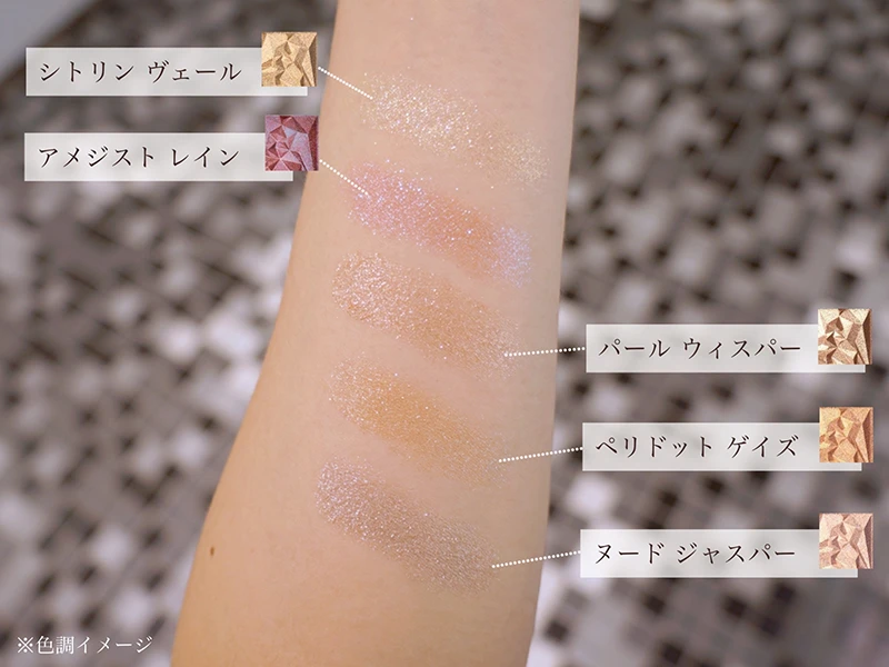 中でも、「シトリン ヴェール」や「パール ウィスパー」は肌なじみの良いカラーなので、目尻から頬にかけてハイライトのように「く」の字型に入れると、抜け感のあるおしゃれな仕上がりになりますよ。