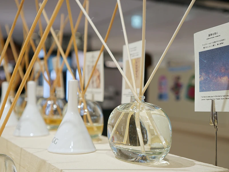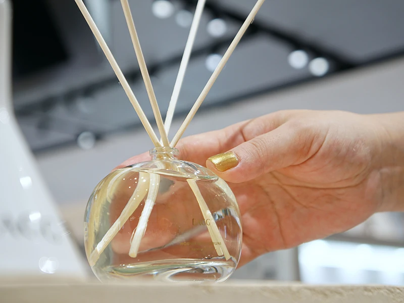 保田のおすすめは、空間全体をやさしく包み込む「ディフューザー」です。10種類あるラインアップの中でも「星降る夜に」は特に人気の香りです。レモン、アップルブロッサムの透き通った香りに、フリージアの華やかさが重なり、クセのあるローレルがアクセントとなっています。アメジストのような煌びやかな夜空に駆け出したいと願う、胸の高鳴りを表現するかのような香りです。