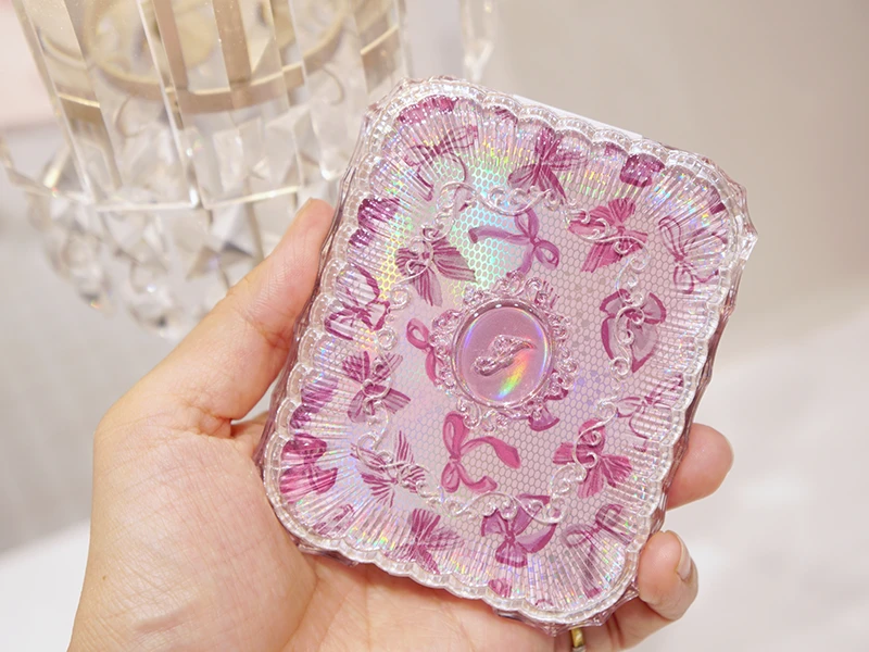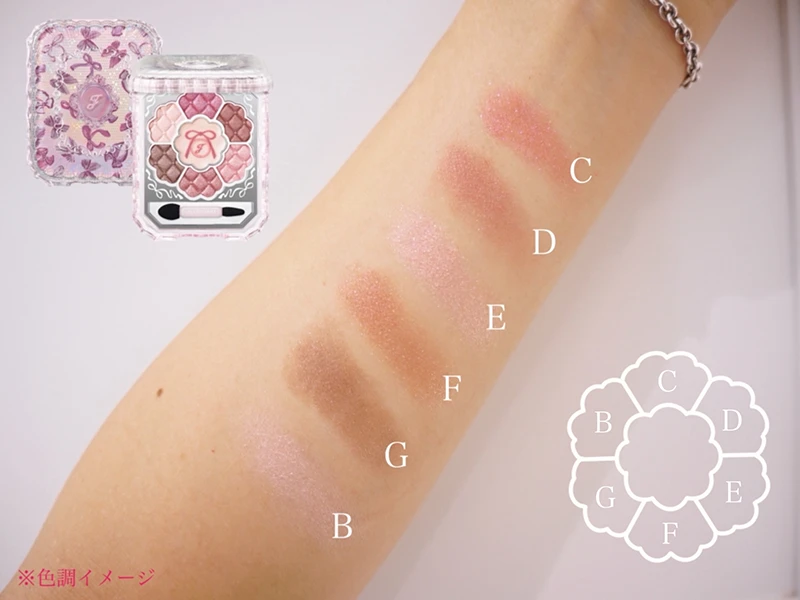 コフレの中でも注目したのは、7色アイシャドウ「ブルームクチュール アイズ リボンファッションショー」。ホリデー限定のロマンティックなカラーで、ピンクトーンをベースに、上品で繊細なラメが全ての色に含まれています。