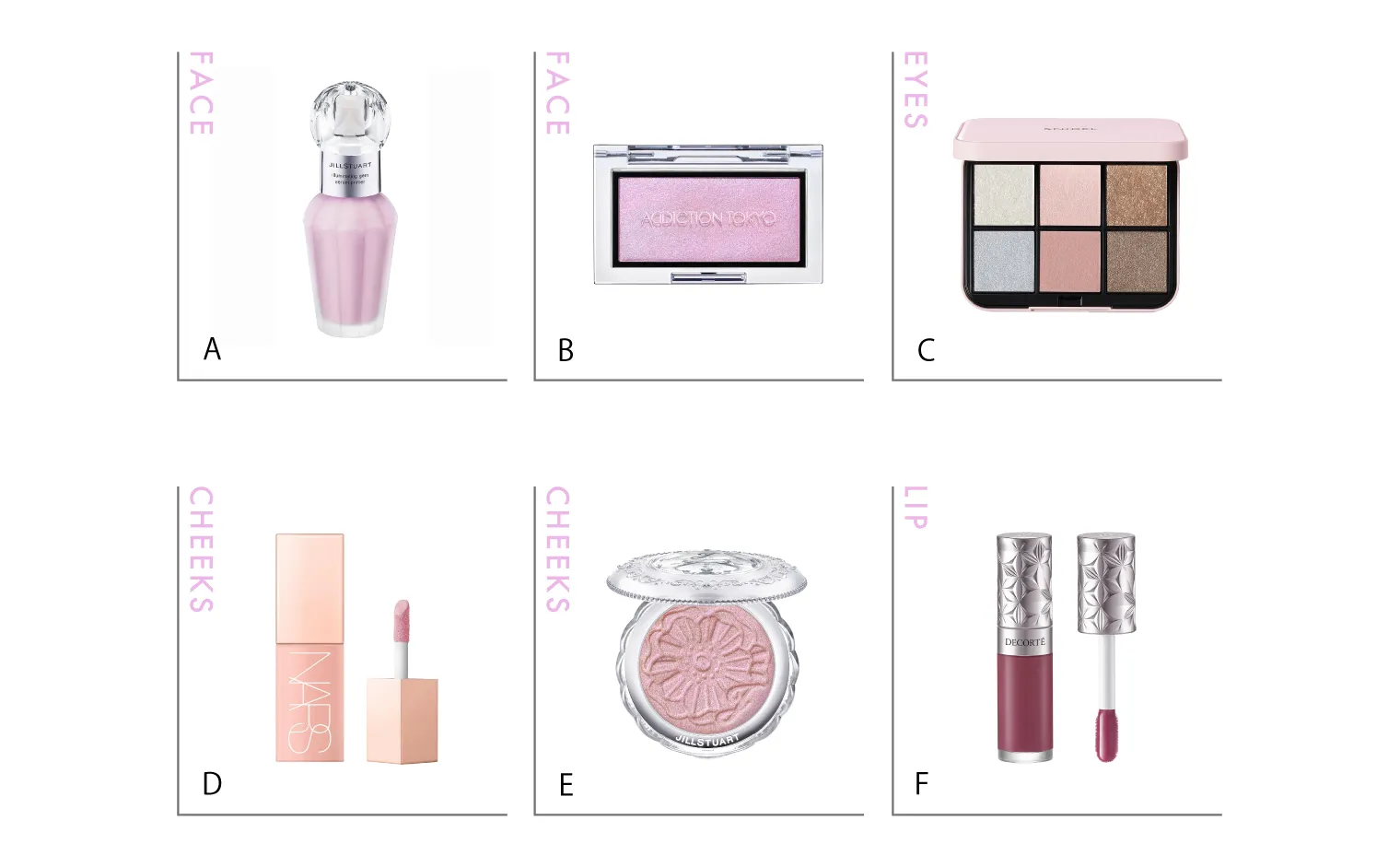 ラベンダーのベースカラーで均一に澄みわたる透明感を。淡めのチークと青みパールのニュアンサーを重ねて光を盛ったら、唇にちゅるんと潤みをオン。