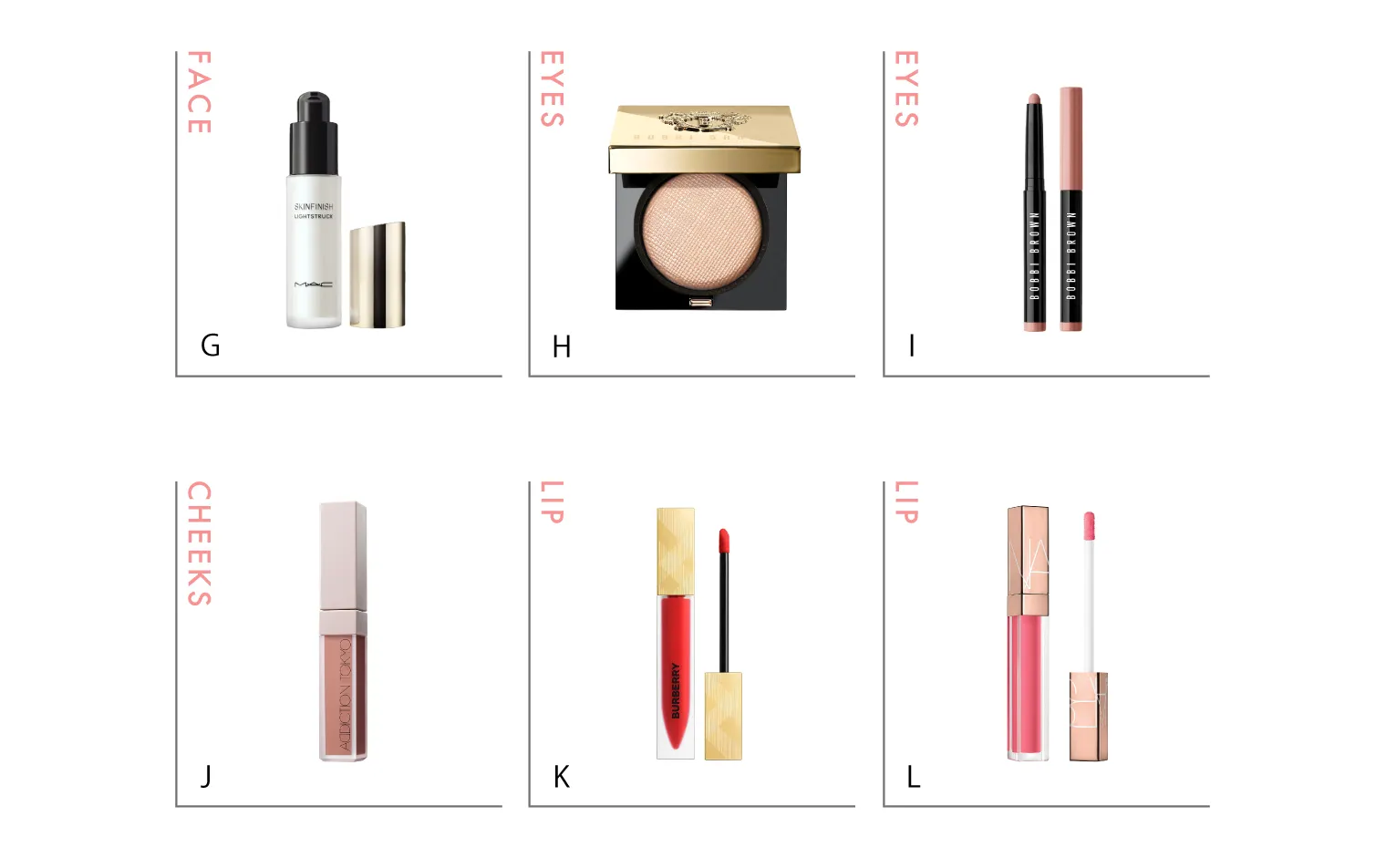 リッチゴールドなラメをまぶたにちらし、まつ毛は根本からカール。ハイライトとリキッドチークで水光肌に整えて。リップは赤ベースでクールに。