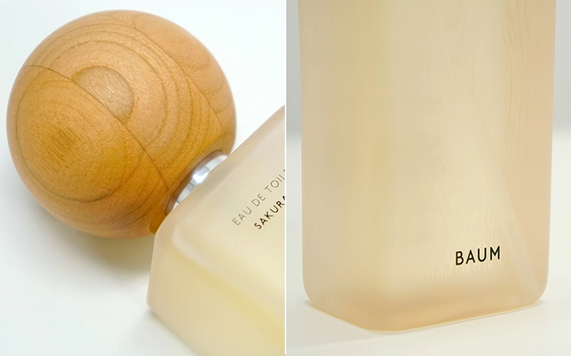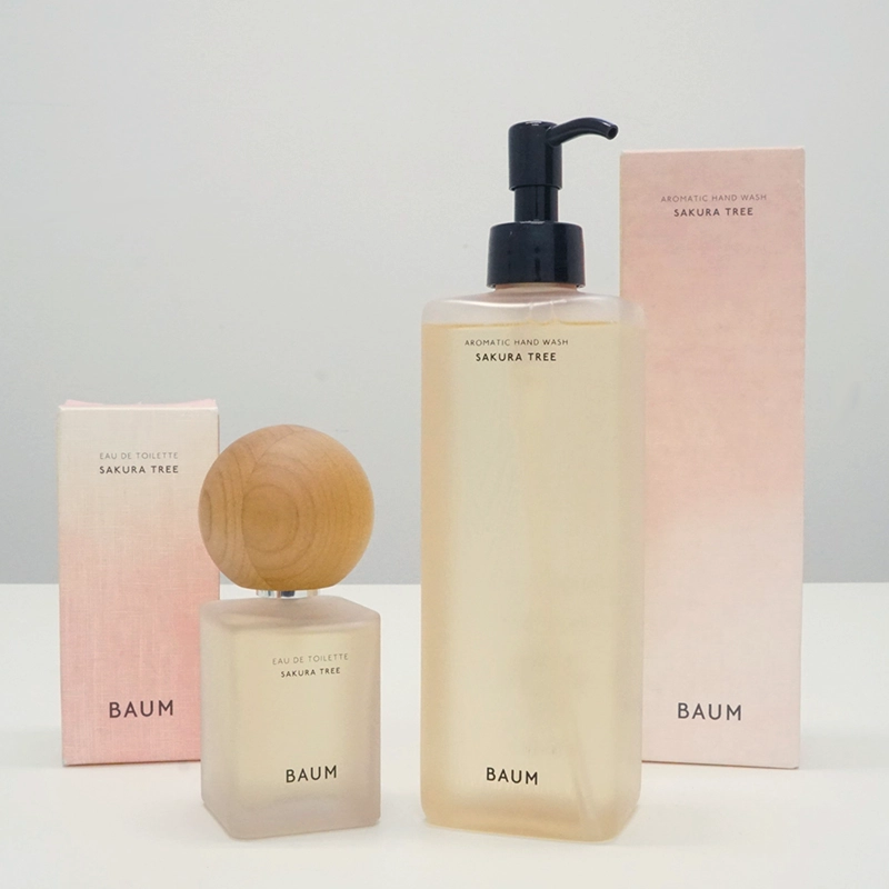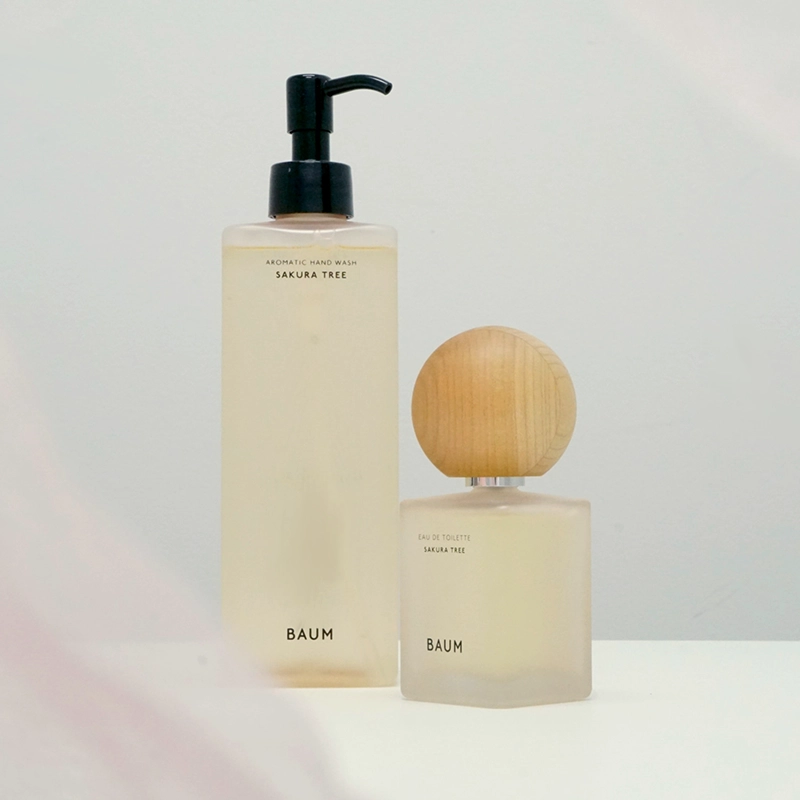 さらにオードトワレやハンドウォッシュのボトルは、ほんのりさくら色に色づいており、木製キャップには山桜材を使用しており、温かみのある色合いです。