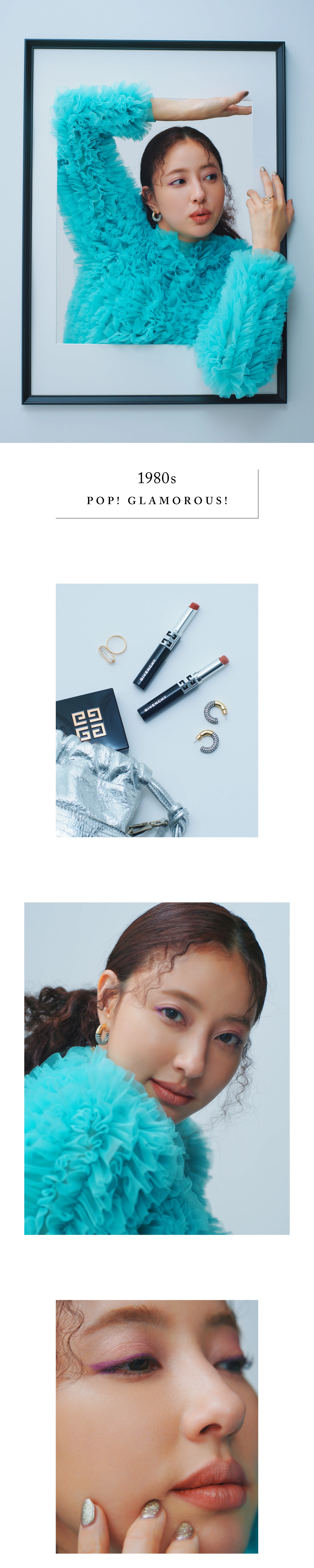 パワフルムードな’80メイクはひとつのルールにとらわれない配色がポイント。唇全体にベージュを、口角にピンクレッドを塗り足し、体温が浮き上がるようなセンシュアルリップに。アイホールにピンクとラメをのせ紫のアイラインを引けば、色めくオトナフェイスが完成。