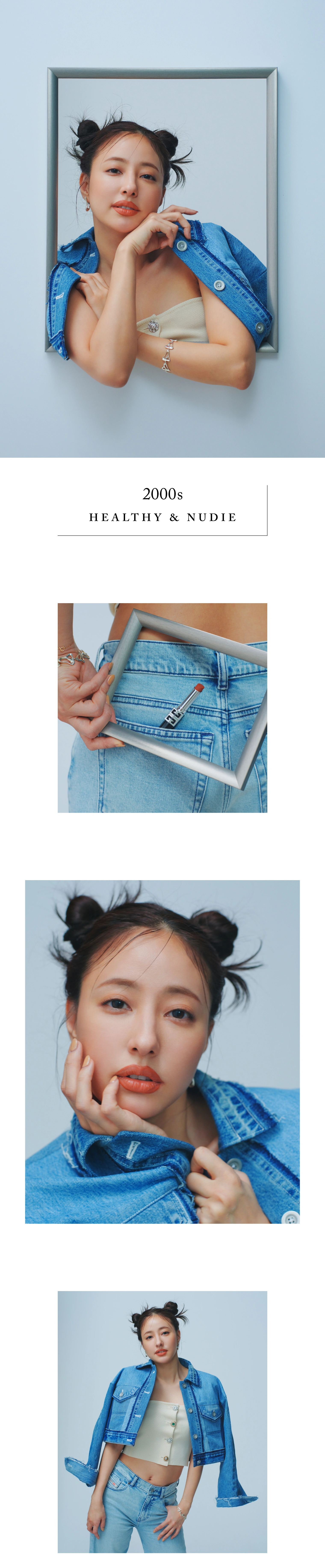 ヘルシーな素肌感を活かすテラコッタの唇。モカ&ベージュトーンのリップライナーでフレームをなぞって肌になじませ、ヌーディーな色気をまとって。頬はブロンズニュアンスで軽やかに、眉はやや細めに整えるとリラクシングなY2Kテンションが一気に加速!