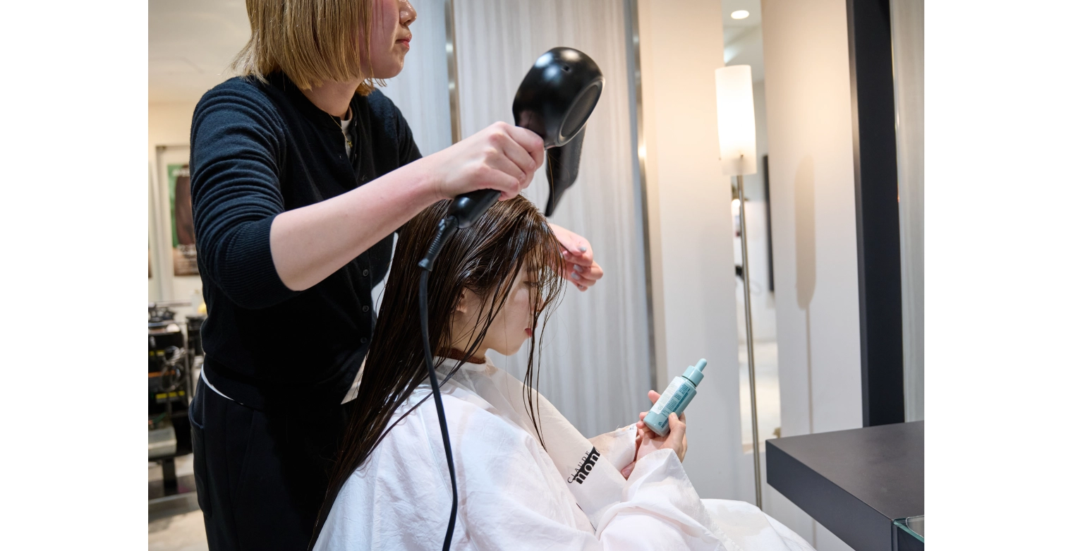 「アウトバスアイテムを適切に使ったブローは寝癖をつけにくくし、ヘアスタイルの再現性を高めます。髪の根元からしっかり乾かしていきますね」