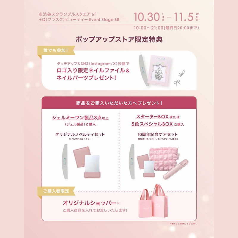 〈Gel Me1 (ジェルミーワン)〉が、2025年10月30日(木)~11月5日(水)の期間、渋谷スクランブルスクエア6F+Q(プラスク)ビューティーにて、期間限定POP UPイベントを開催する。