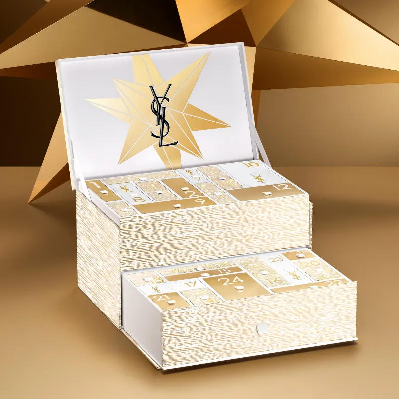 YSLの人気製品の現品と、メイクアップ、スキンケア、フレグランスなどのミニアイテムが入ったアドベントカレンダー。ホリデーの夜を輝かせる星が大胆にデザインされたときめくパッケージで登場。