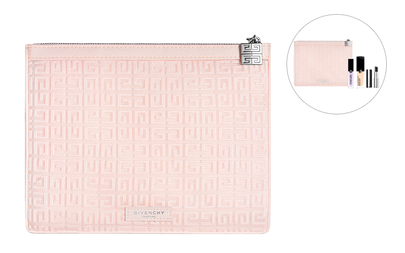 ジャガードデザインのフラットピンクポーチ。全体にジバンシイの4Gロゴが施され、ファスナー部分にはシルバーの4Gチャームがあしらわれたアイコニックなデザイン。