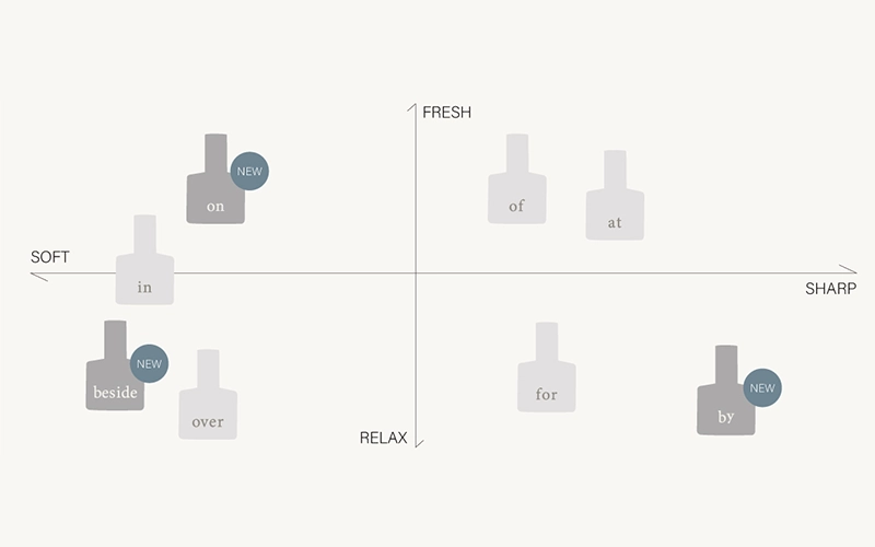 前置詞は時間や空間を切り取る言葉であり、香りは時間や空間の記憶とリンクするもの。装いや気分にニュアンスを添える存在としてのフレグランスを表現した。選ぶ香りによって異なる雰囲気や気分を纏うことができるように、関係性をつなぎ、ニュアンスを演出する役割として香りの名称には「前置詞」を採用。