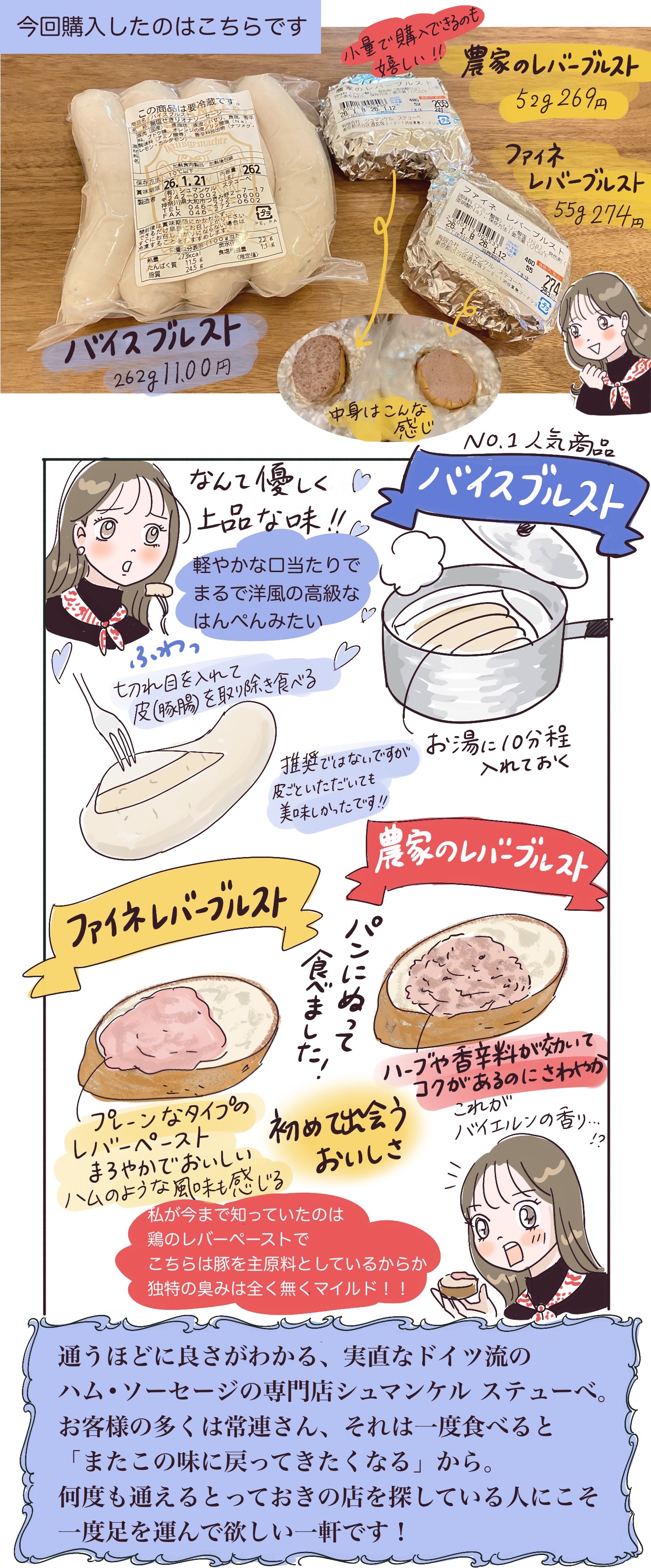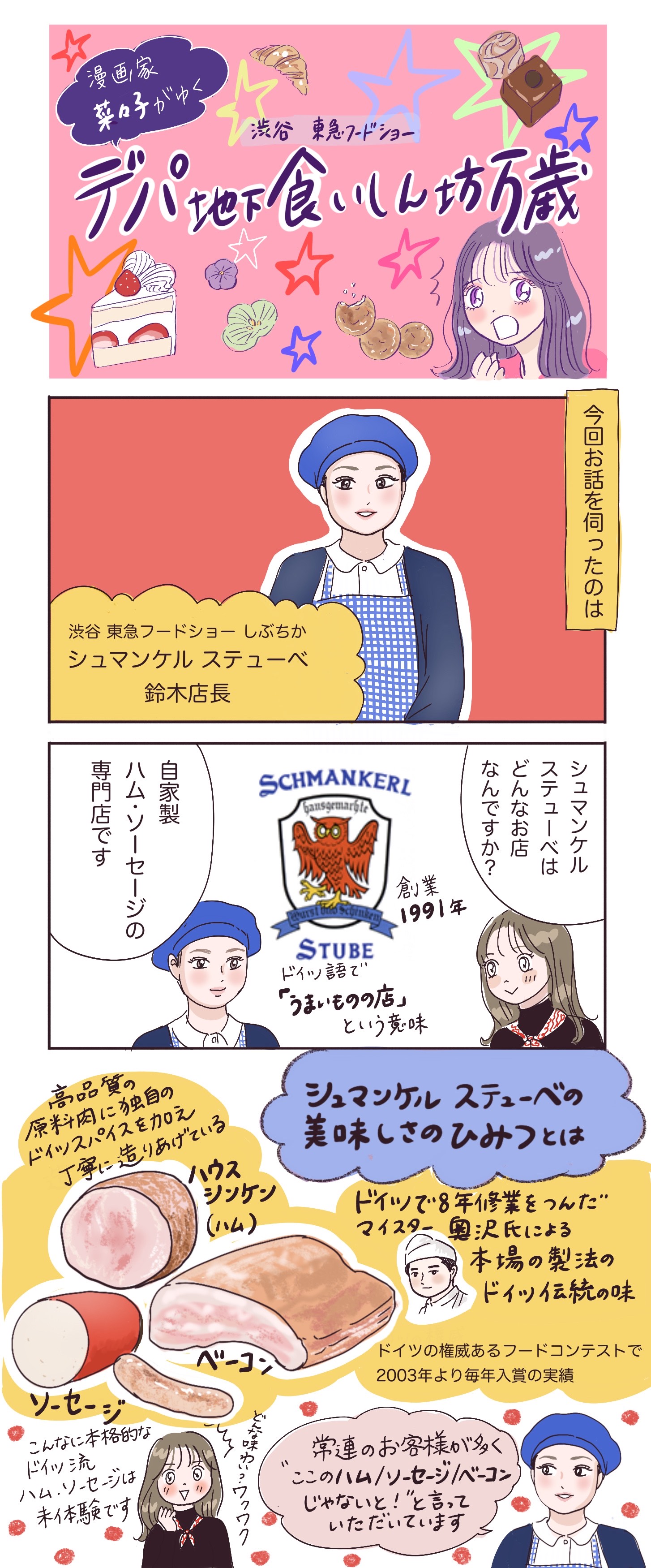 渋谷にはおいしいグルメがたくさん!歩くだけでも楽しいデパ地下から、漫画家・菜々子がおすすめのグルメの裏側をご紹介します。今回は渋谷 東急フードショー(しぶちか)にある、本場ドイツでの修行を経てマイスターの資格を取得した奥沢一郎氏が手掛ける本格ドイツハム・ソーセージの専門店〈シュマンケル ステューベ〉です。