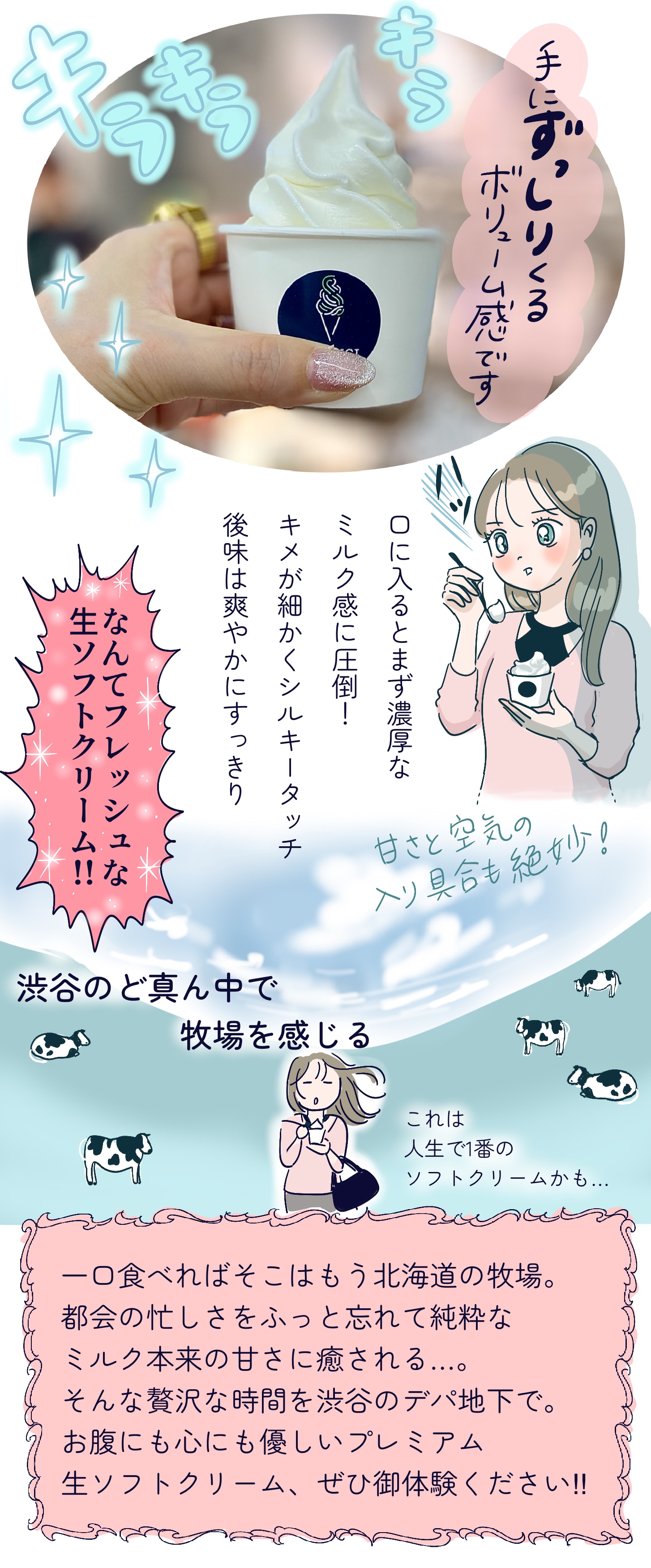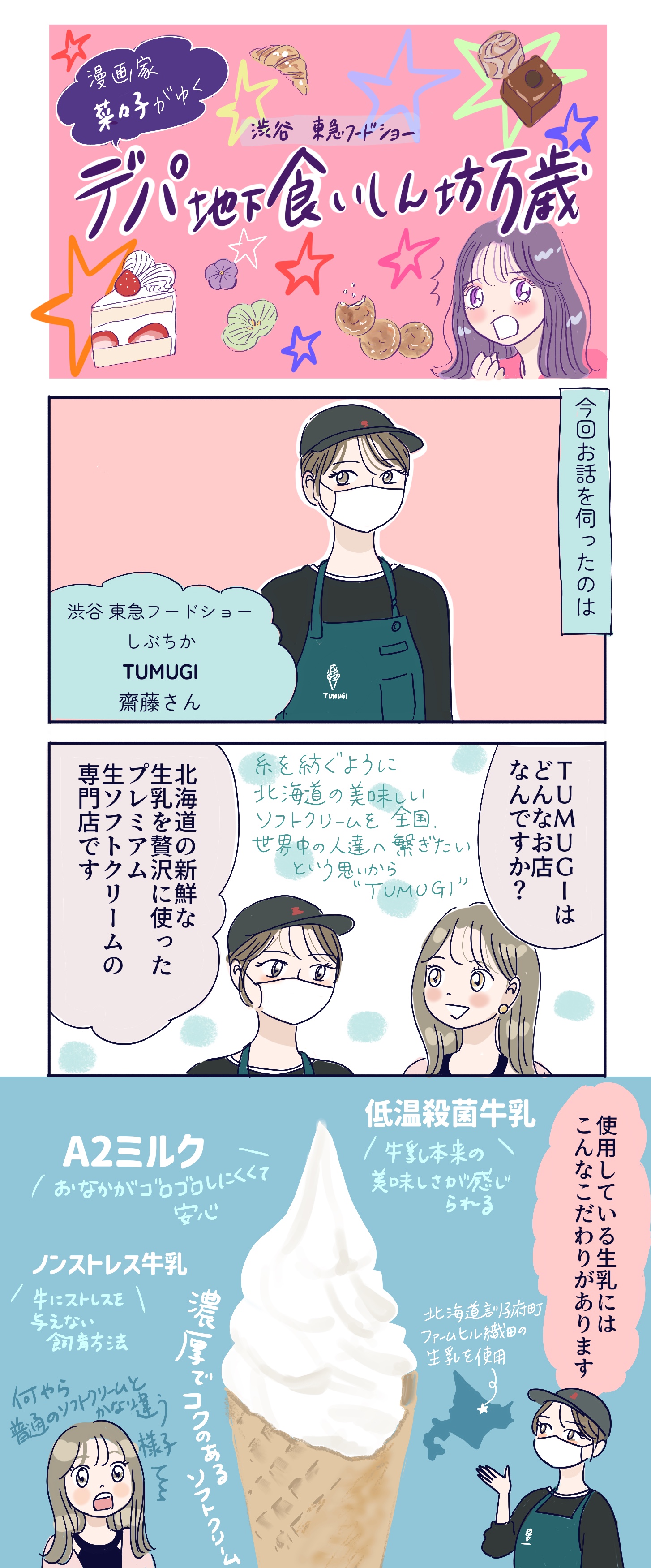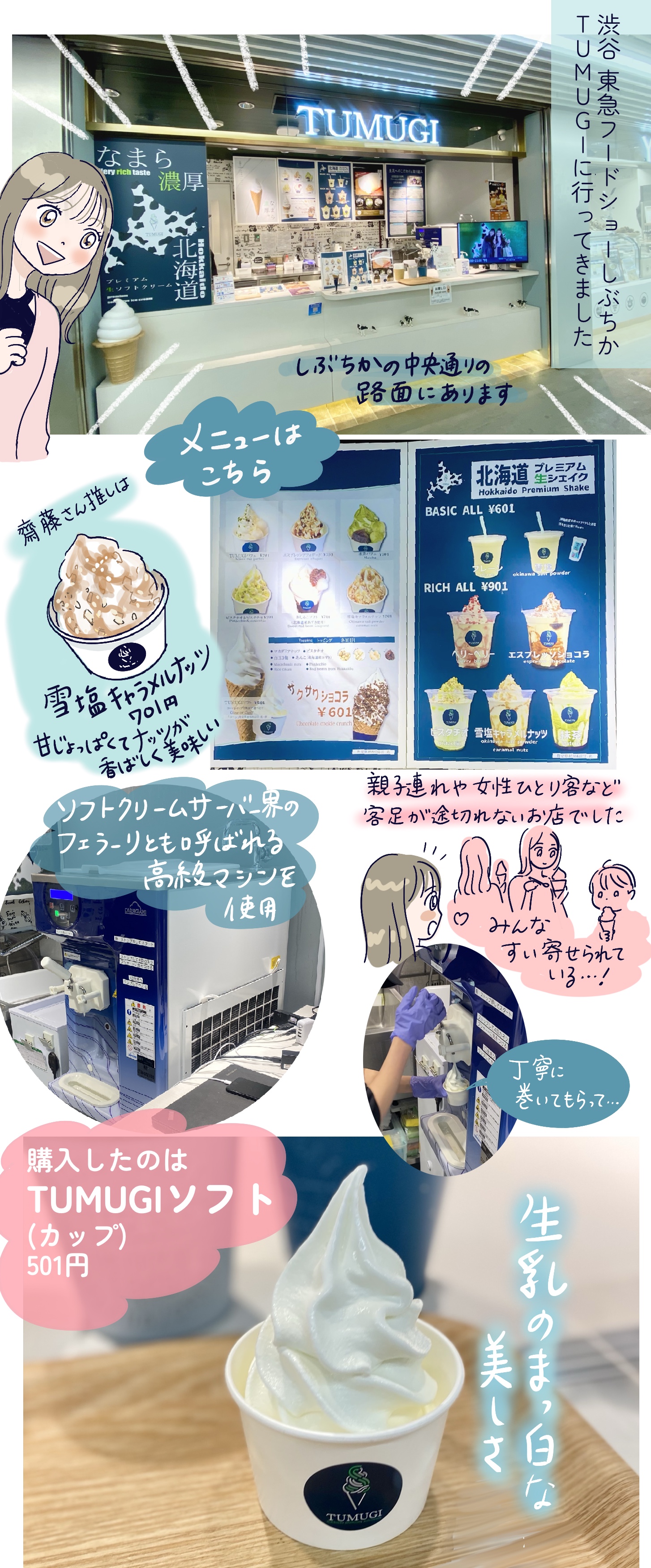 渋谷にはおいしいグルメがたくさん!歩くだけでも楽しいデパ地下から、漫画家・菜々子がおすすめのグルメの裏側をご紹介します。今回は渋谷 東急フードショー(しぶちか)にある、北海道産の新鮮な生乳を贅沢に使用した、濃厚でコクのあるソフトクリームが楽しめる〈TUMUGI(ツムギ)〉です。