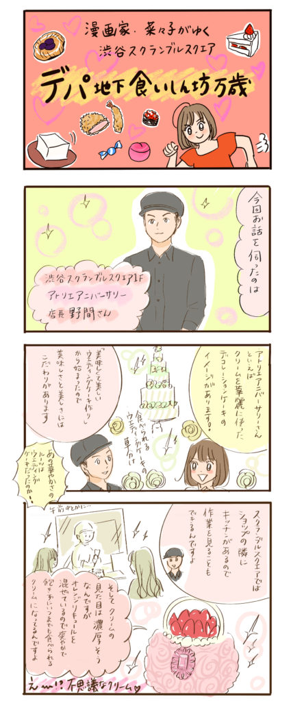 渋谷にはおいしいグルメがたくさん!歩くだけでも楽しいデパ地下から、漫画家・菜々子がおすすめのグルメの裏側をご紹介します。第34回目は渋谷スクランブルスクエア ショップ&レストランの1F東急フードショーエッジにある、大人も楽しめるデコレーションスイーツをテーマにした「Atelier Anniversary(アトリエ アニバーサリー)」です。