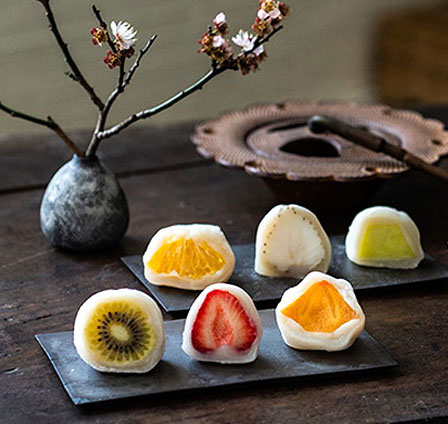 フルーツ本来の味を引き立てる白餡と求肥の黄金比にこだわりました。市場から直送される季節のフルーツを、素材の味を生かした甘さ控え目の白餡と、高級羽二重粉を使用した上品な求肥で手包みしたフルーツ大福をお楽しみいただけます。