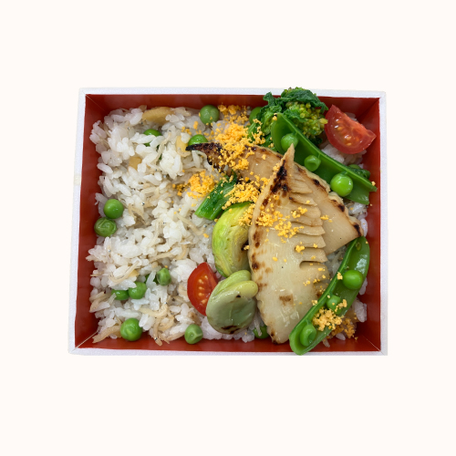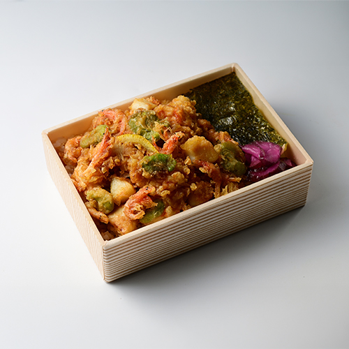 旬の食材「桜えび・そら豆・筍」を使用したかき揚げです。桜えび、そら豆の香りで春を感じられるお弁当です。この機会にぜひご賞味ください。