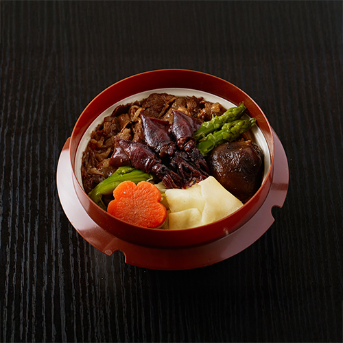 和牛の旨味を炊き込んだ肉飯に、旬のホタルイカとアスパラを彩りよく添えた春の贅沢弁当です。