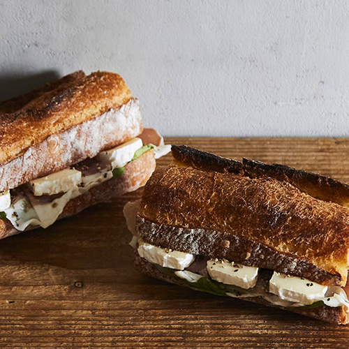 北海道産小麦のバケットにオリーブオイルを塗り、生ハム・ルッコラ・北海道産カマンベールチーズを挟みました。春のお出かけランチにもピッタリな一品です。