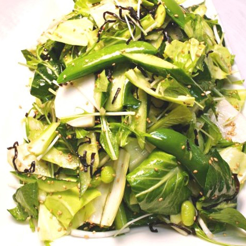 スナップエンドウ入りグリーン野菜の塩昆布サラダ