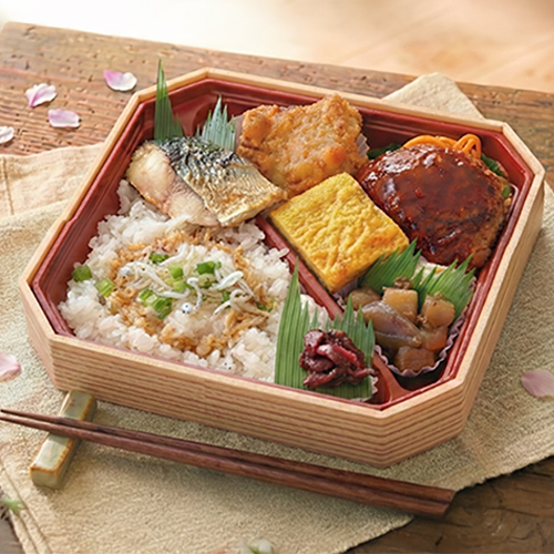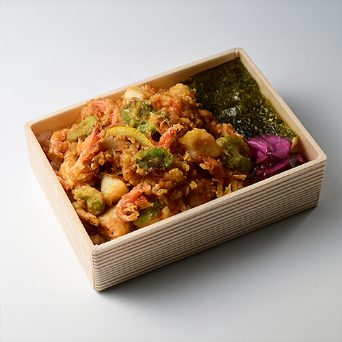旬の食材「桜えび・そら豆・筍」を使用したかき揚げです。桜えび、そら豆の香りで春を感じられるお弁当です。この機会に是非ご賞味ください。