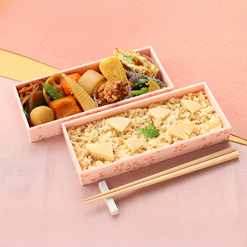 旬の筍を炊き込んだご飯にたっぷりのおかずが入った二段弁当です。