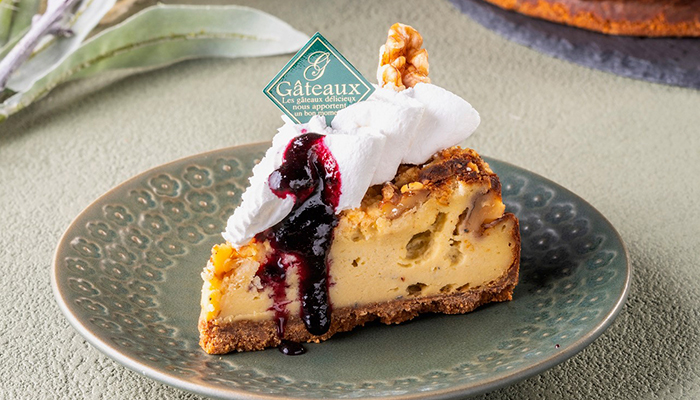 香り高いゴルゴンゾーラの奥深いコクと塩味が、国産ブルーベリーのみずみずしい酸味と美しく響き合う一品。仕上げのブルーベリーソースが芳醇な余韻を添えます。甘さだけに頼らない、大人のためのブルーベリーチーズケーキです。