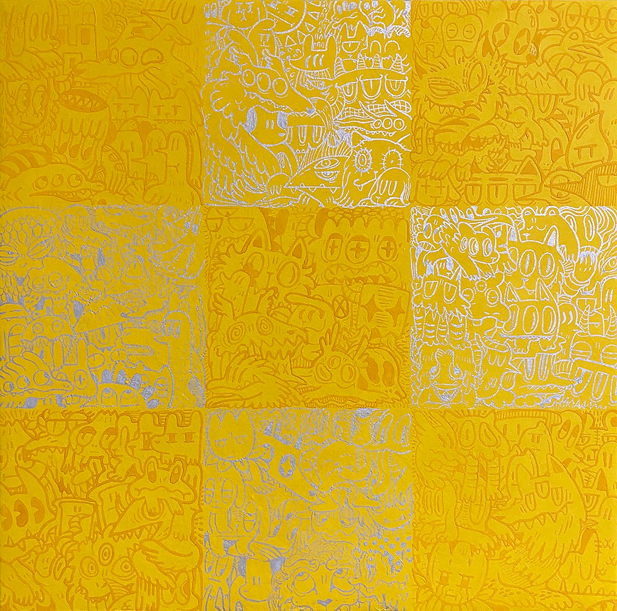 黄色、青、緑のポップな色彩の中で、モンスターたちが筆の動きに導かれるように描かれた画面には、彼女の内面から立ち上がったモンスターたちが集うように現れ、密度のある画面を形づくっています。