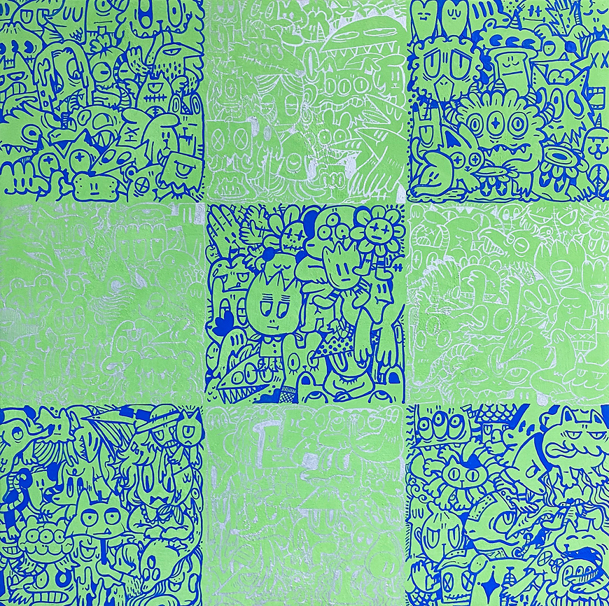 小林繭乃は、その市松模様の一枠一枠に、自身が描き続けてきたモンスターたちを描き込んでいます。