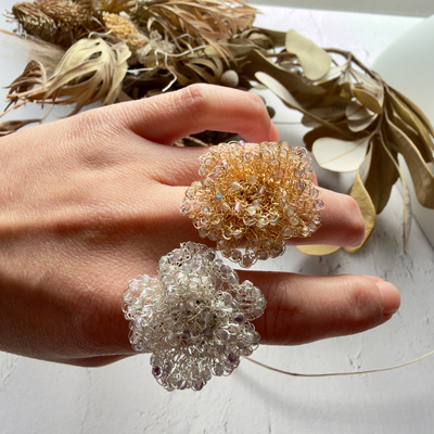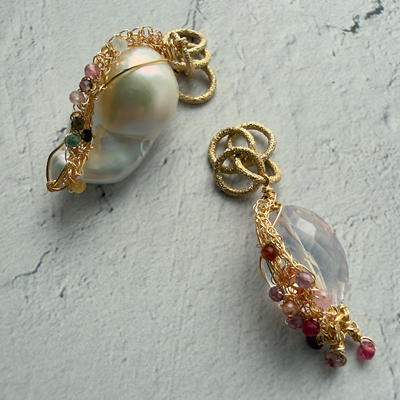 金属をかぎ針で編んでつくる、羽根のように軽く、レースのように華やかなアクセサリー。