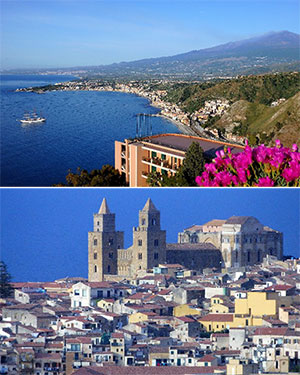写真 下:王妃が逃げ伸び歴史ある建物も多いエトナの街。