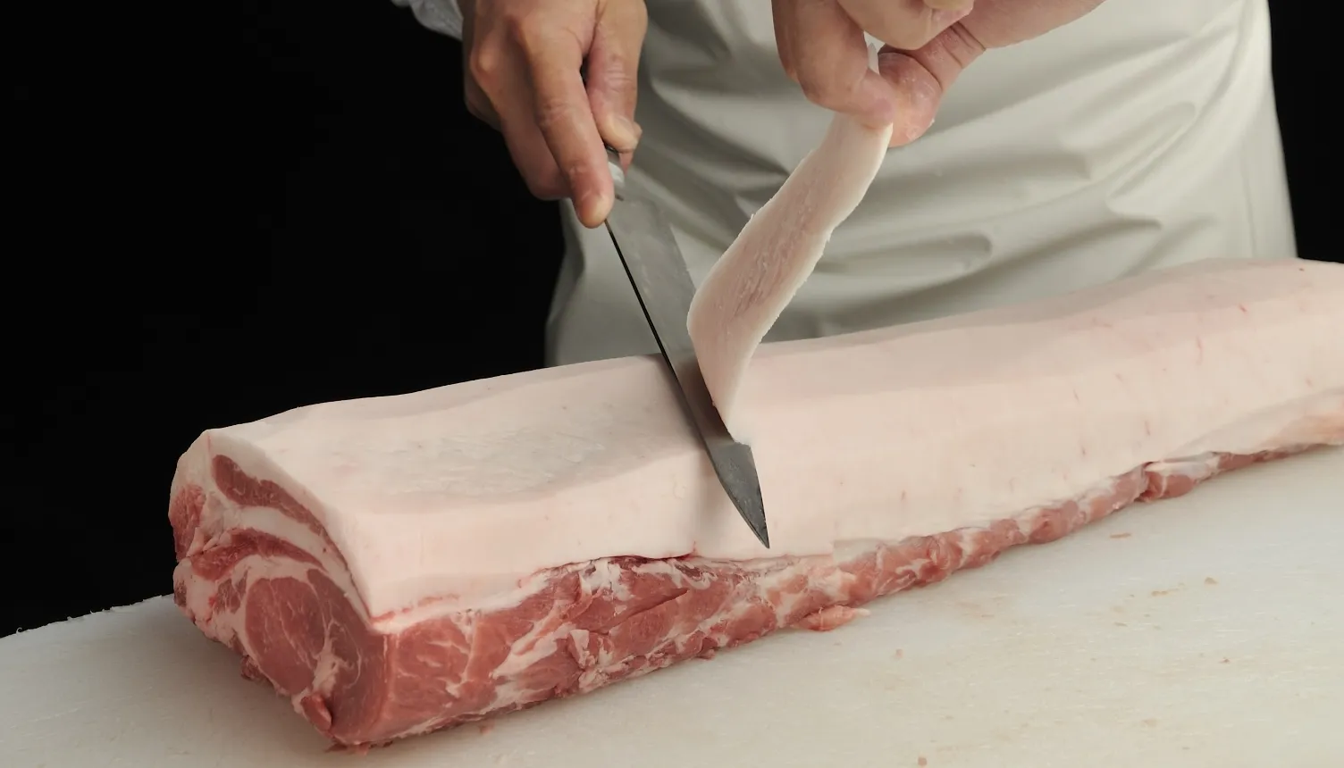 那須井さん: 工程はまず、国産の豚ロース肉を整形する「磨き」の作業から。芯(赤身)と脂肪が程よいバランスになるように、余分な脂肪やスジ、軟骨などを丁寧に取り除いてロースの塊を作ります。すべての始まりとなる大事な作業です。
