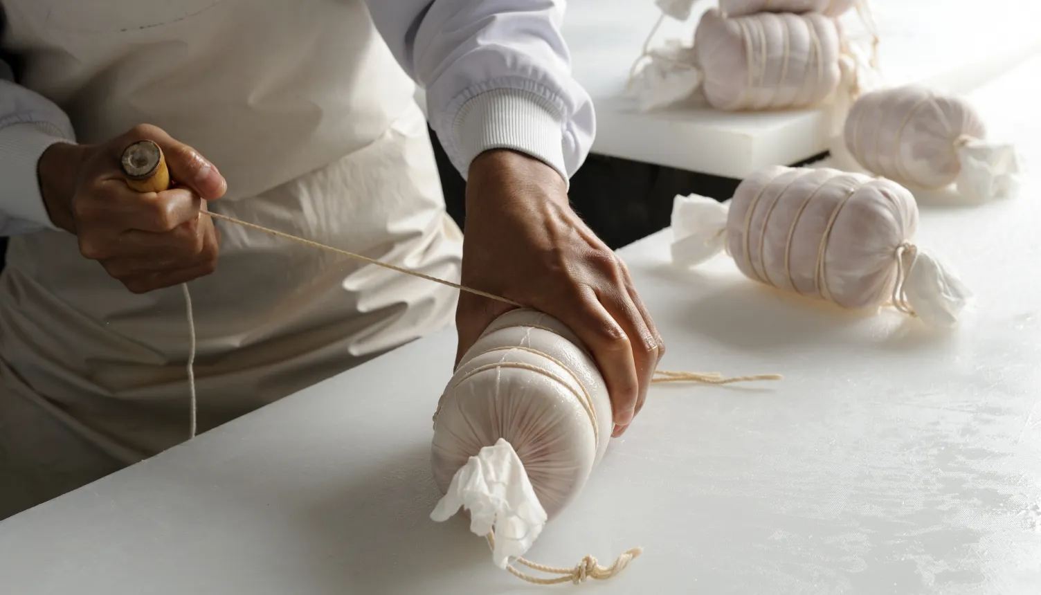 那須井さん: 次が、一連の工程の中でも最も熟練を要する「布巻き」の作業。漬け込みを終えた肉を職人が手作業で布にくるみ、糸で締めて、1本のハムの原型を作ります。しっかりと包み込まれていないと最終的にハムの形が崩れたり、割れたりしてしまうので、最重要の工程ですね。糸を巻く強さのサジ加減は、経験と勘に頼ったまさに職人技。一人前といえる作業ができるようになるまでには10年は掛かります。