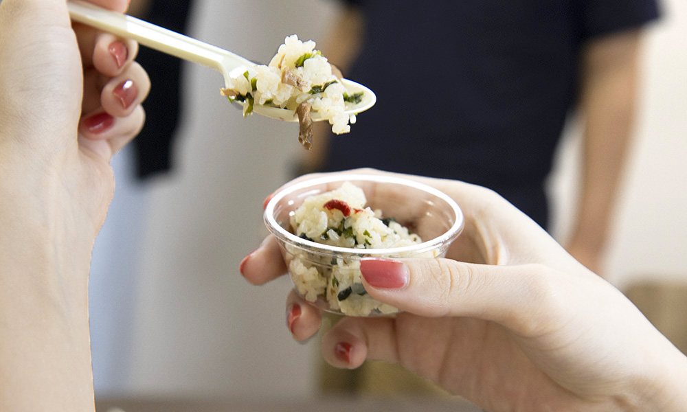 今回の試食会で圧倒的一番人気!そのまま食べてもおいしいアルファ化米の『わかめご飯』。アルファ化米との相性がわかめの旨みと塩気に加え、『野菜たっぷり きのこのスープ』で戻したら、イタリアンリゾット風に!