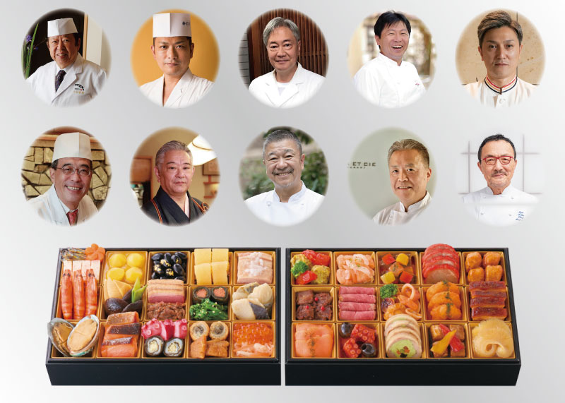 まるで真っ赤なカーネーションのように、鮮やかな色彩が目をひく紅華手鞠を両脇に、手鞠赤海老やおぼろ昆布しめ鯖棒寿司など贅沢な食材をふんだんに使用しました見目麗しい手鞠寿しは、ふたを開けた瞬間、宝石のような輝きを放ちます。