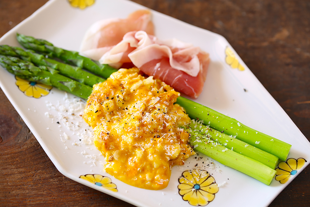 濃厚な卵とチーズのソースとアスパラガスの相性は抜群!お好みで生ハムも巻きつつ食べてみてくださいね。キリッと冷えた白ワインと合わせると最高の組み合わせですよ。おもてなしにも、晩酌にもぴったりのレシピです。