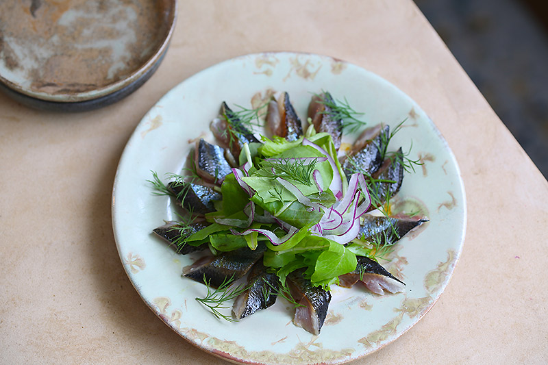 4、さんまを器に盛ったら、混ぜ合わせたAの半分をかけ、1、ディルを乗せる。仕上げにAの半分をサラダ部分にもかける。