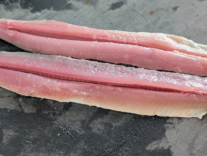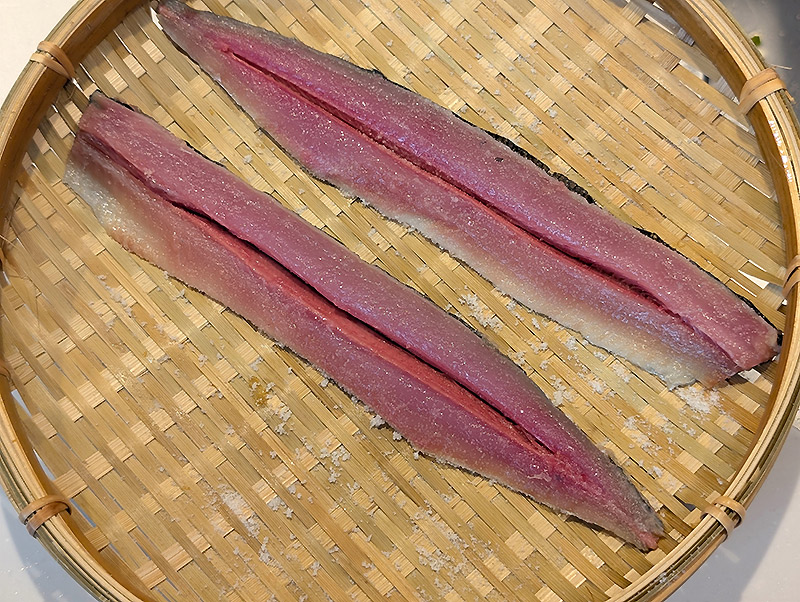 2、さんまは3枚におろしたら、ガンバラをとる。中骨をV字にとる。ふり塩をし15分おく。さんまを洗いペーパーで水気をしっかりととる。