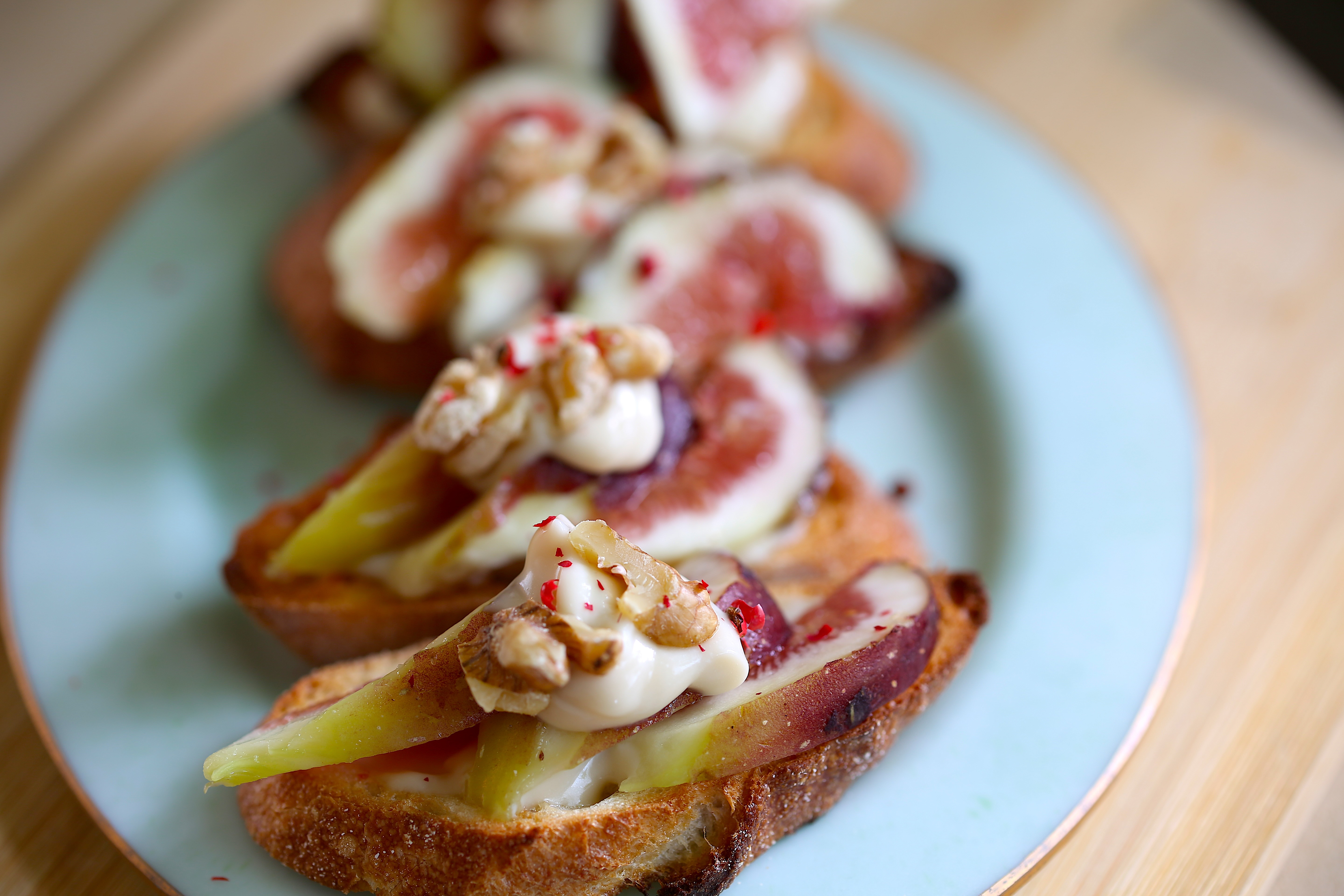 4、3にマスカルポーネの2/3塗り、いちじくを乗せたらマスカルポーネをさらに上にのせ、くるみを飾りピンクペッパーを散らす。