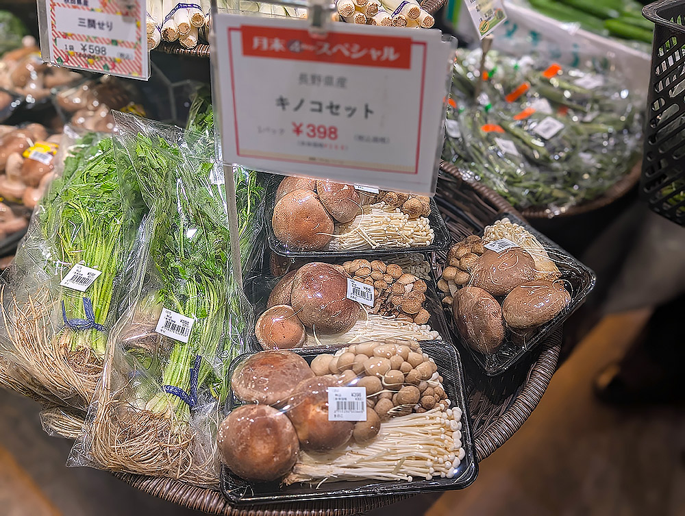 様々な種類のきのこがあってどれにしようか悩むところ。色々な種類のきのこを食べたい!という方にぴったりの「キノコセット(¥398)」をゲット。
