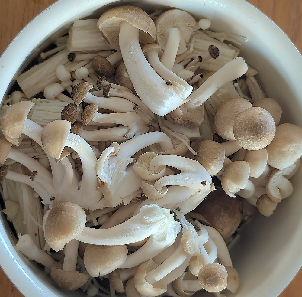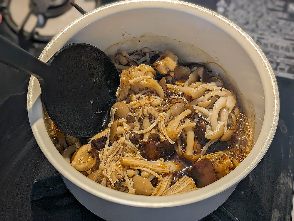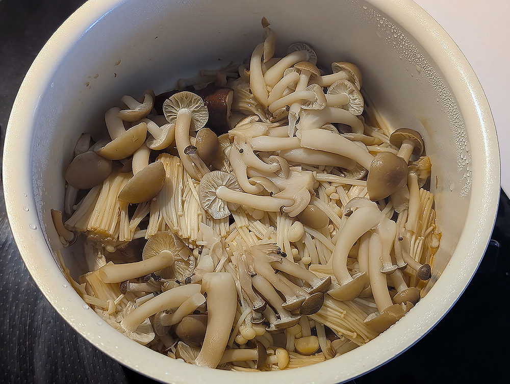 1、椎茸は石づきを切り、手でざっくりと割く。えのきは石づきを切り、二等分にする。しめじは石づきを切り、ほぐす。