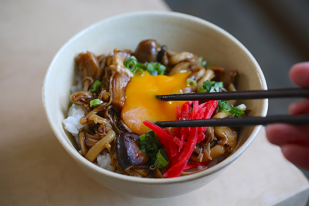 きのこだけなのに、満足感が高い丼の完成。紅生姜の辛味が絶妙にマッチするのでぜひ紅生姜はお忘れなく。