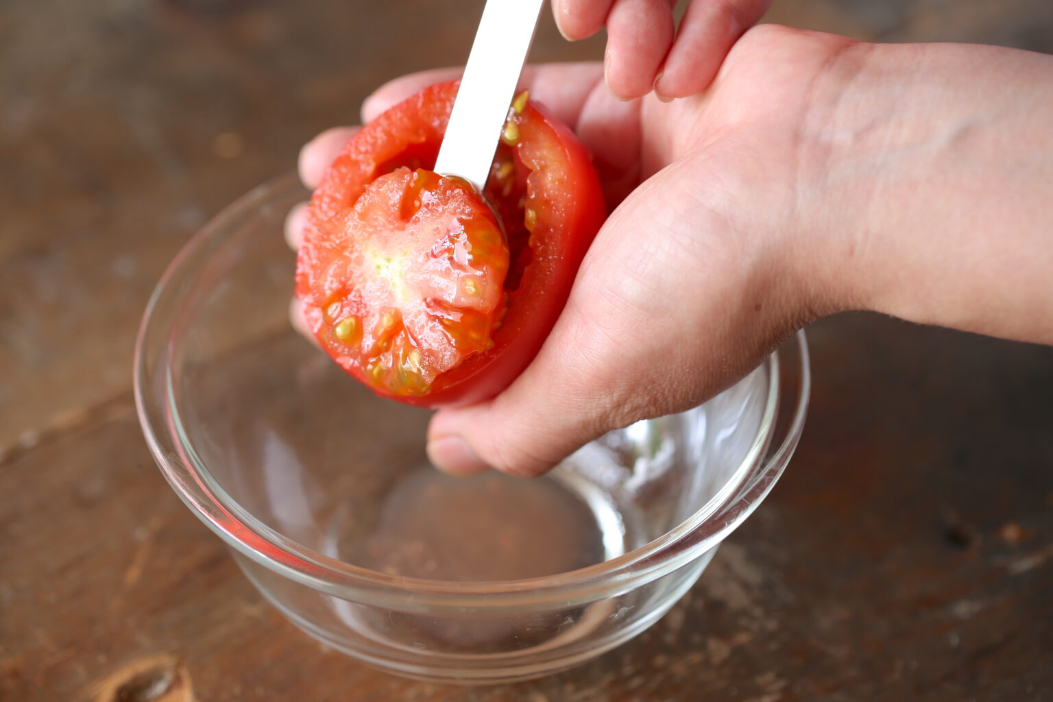 2、トマトの中身と荒く崩した肉団子を混ぜ合わせる。